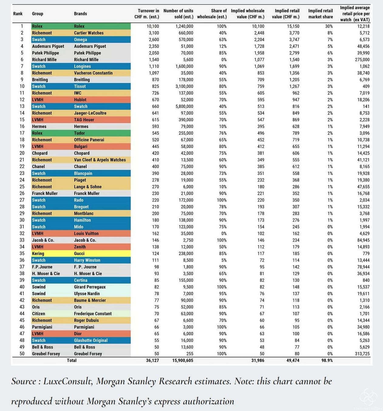 与往年一样,领先的品牌——劳力士、百达翡丽、爱彼和理查德·米勒——继续获得市场份额。奢侈手表市场与所有其他奢侈品细分市场不同,在这些细分市场中,上市集团和品牌分别领导各自的产品类别。