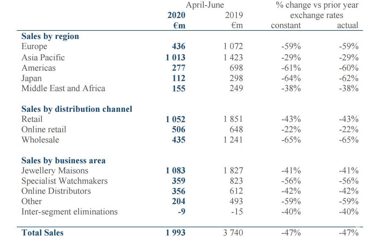 由于中国市场在第二季度出现强劲恢复,整个亚太区的销售额同比下降不到30%。按渠道来看,线上零售的份额明显增大,下降幅度也不高。珠宝的下降幅度也明显低于钟表板块。