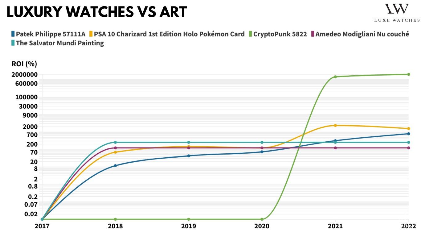 我们将艺术品NFT投资与回报率方面最好的手表百达翡丽57111A进行比较时,我们发现其投资回报率稳步上升,这意味着与艺术品投资的波动性相比,这是一种更安全的投资选择。