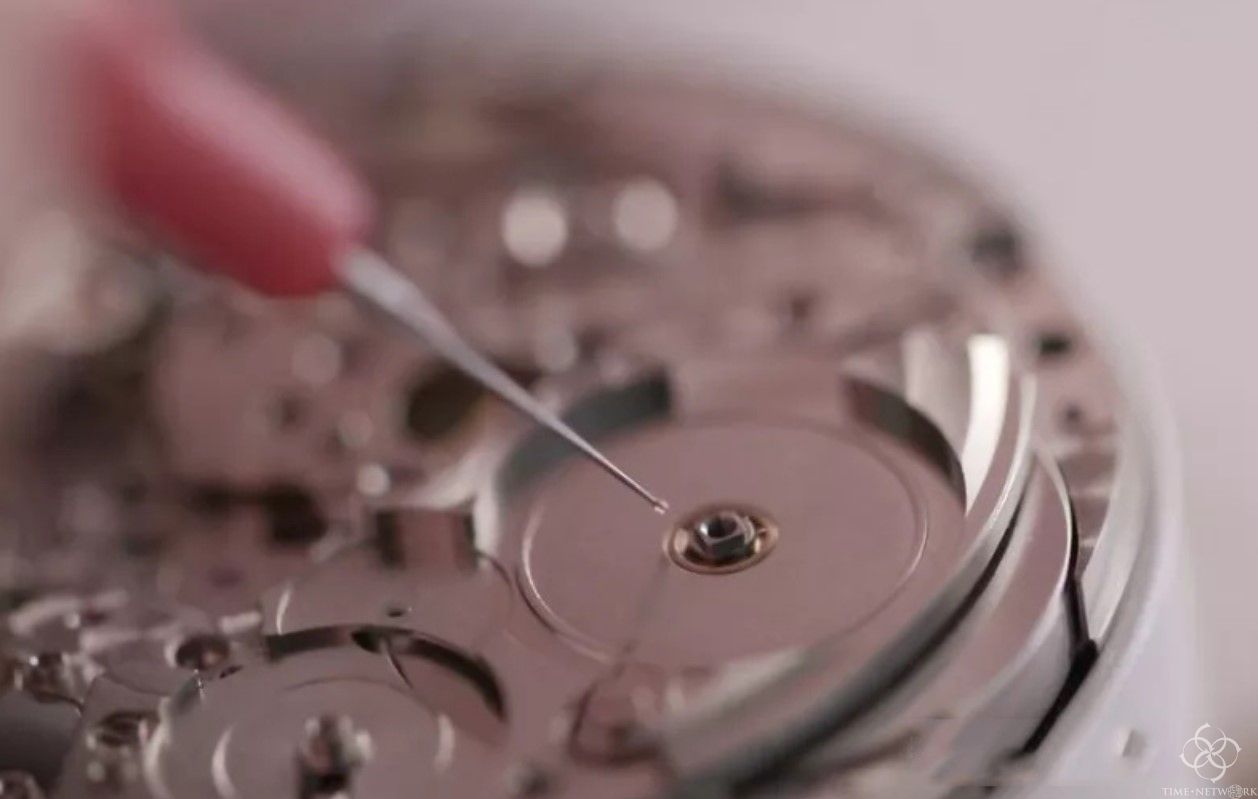 最考验维修技师功力的是擒纵叉宝石端面的加油,操作过程中必须非常稳定和精确,用油针将润滑油精确地点在笔尖大小的宝石端面的正中间。