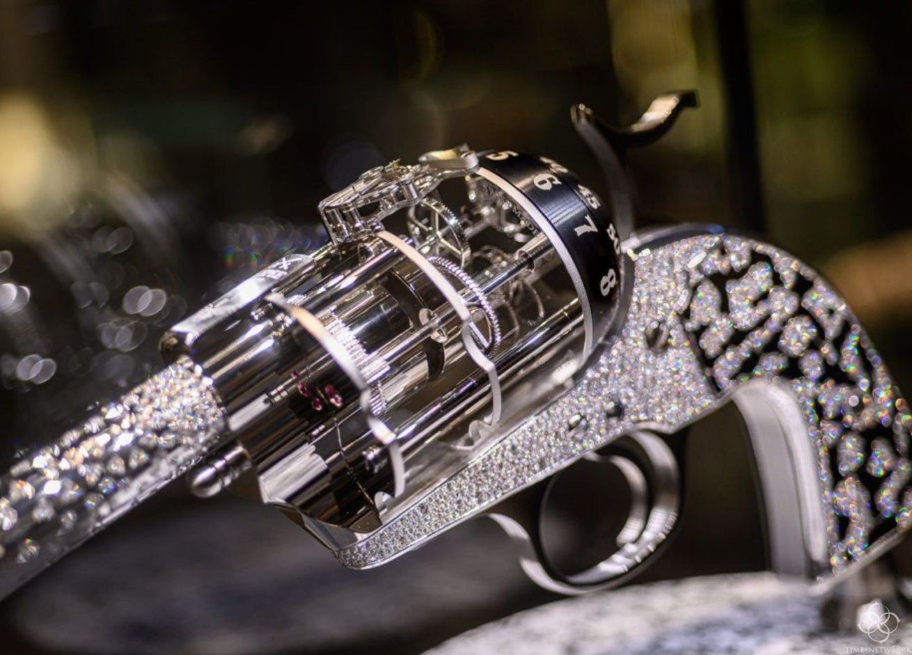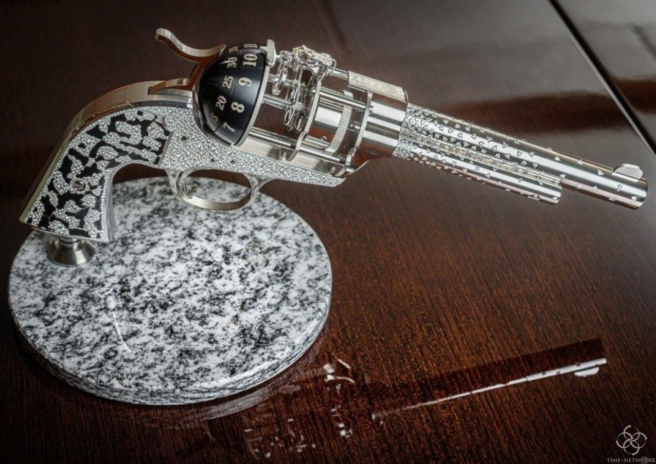一把镶满钻石的左轮手枪,这应该是非常独特的礼物,但是左轮部分是一个机械钟结构,也许,这把手枪的子弹就是“时间”!