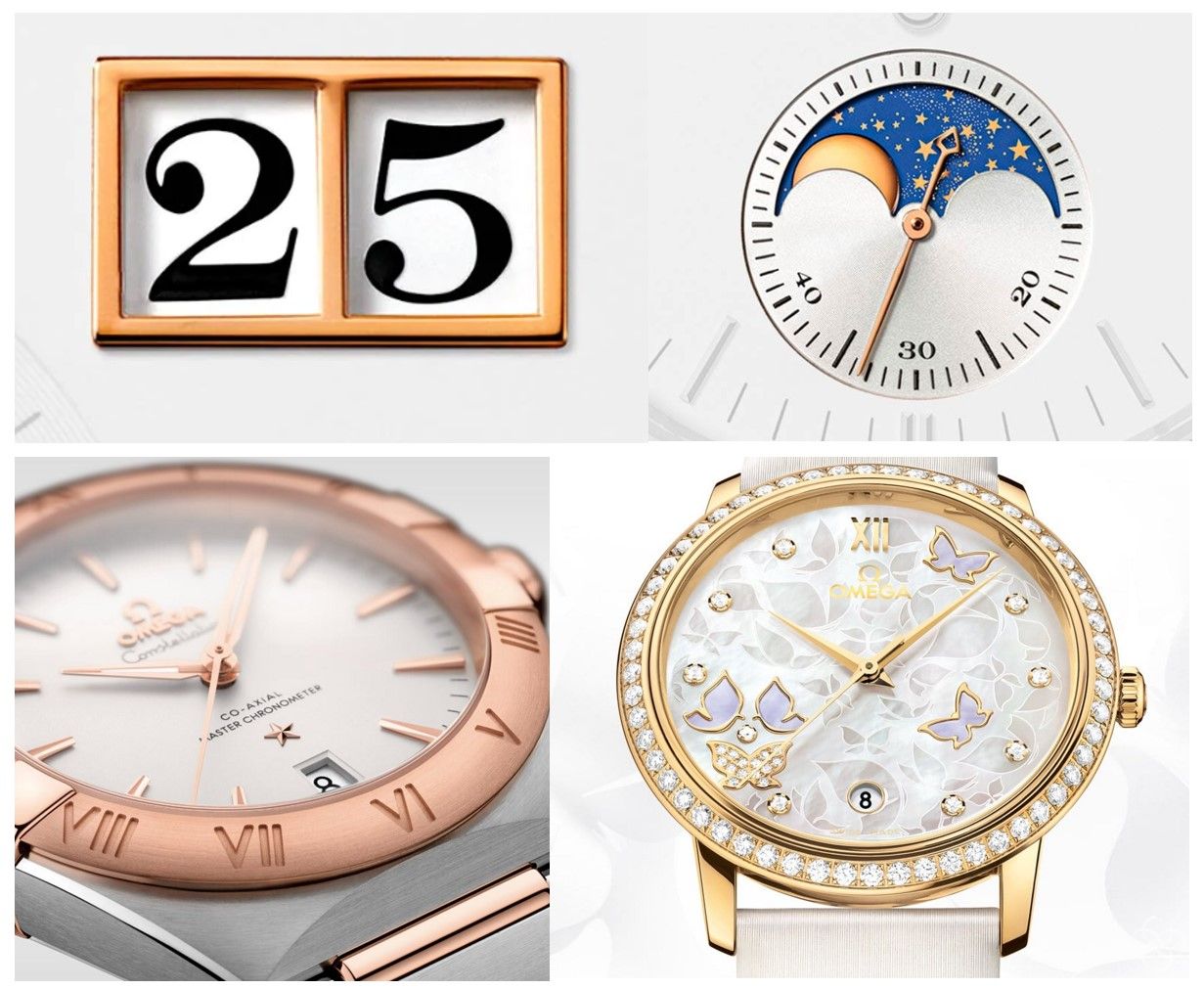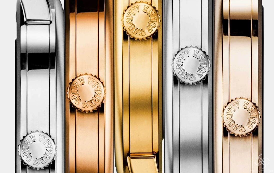 通常的金表都是含有75%黄金的手表,也有用铂金制作的手表,更加稀有。这些金表因为添加了其他金属,呈现不同的色泽。下图中分别是950铂金,750玫瑰金,750黄金,750白K金,750蜂蜜金。