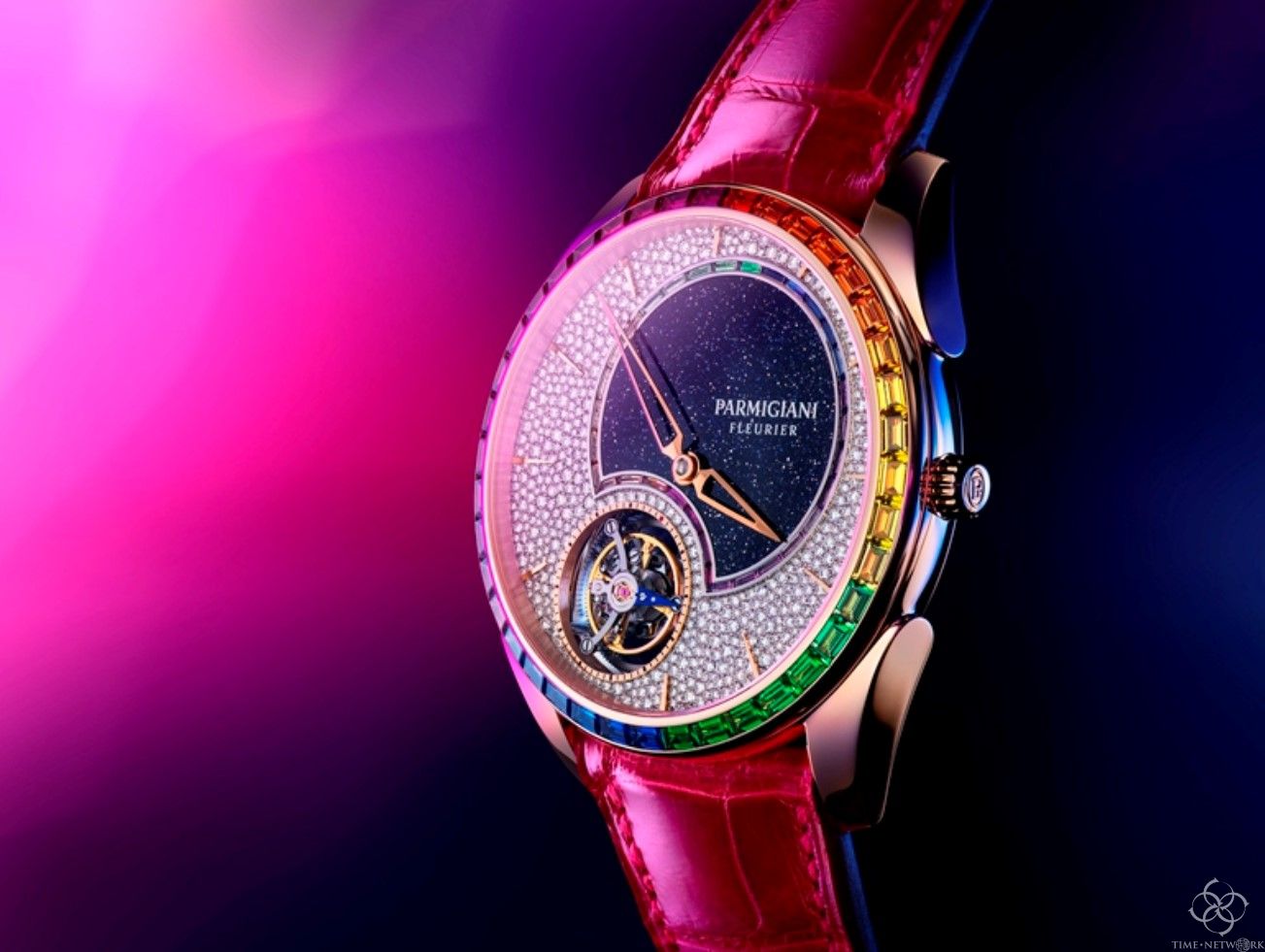 帕玛强尼通达系列TONDA 1950双彩虹飞行陀飞轮腕表,表盘上的白色钻石、彩色宝石以及砂金石弯月造型相映生辉,以彩色宝石镶嵌而成的表圈同样华彩熠熠,惊艳瞩目。正如春日里的优雅女性,于繁花似锦的烂漫景色里绽放迷人色彩。