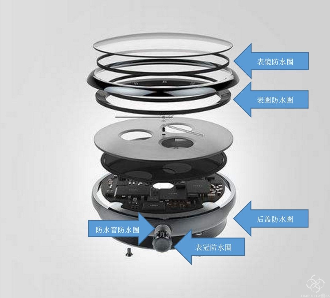 一枚普通防水表,涉及的防水圈有4-5处,专业的防水表的防水圈就更多了,据说有一种顶级的防水表,可以有接近1000米的防水性能,它的后盖防水圈是用24K黄金制成的。