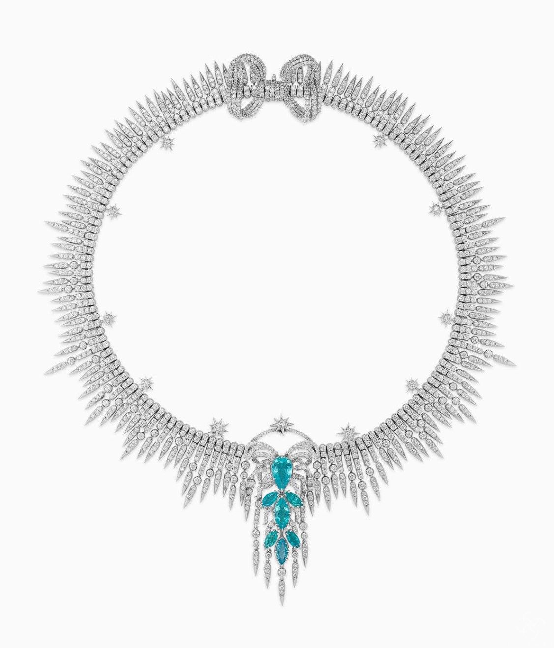 第一部分以自然景观为重点,勾勒出钻石洪流中崩塌的瀑布,重新思考被风吹过的森林,形成诱人的曲线轮廓。在这个幻想的世界里,树叶在钻石树枝上颤动,彗星在布满钻石斑点的天空中飞过。米歇尔向二十年代的自由流动的形式点头,流苏和流苏项链和枝形吊灯耳环点缀着美丽的宝石圆球。