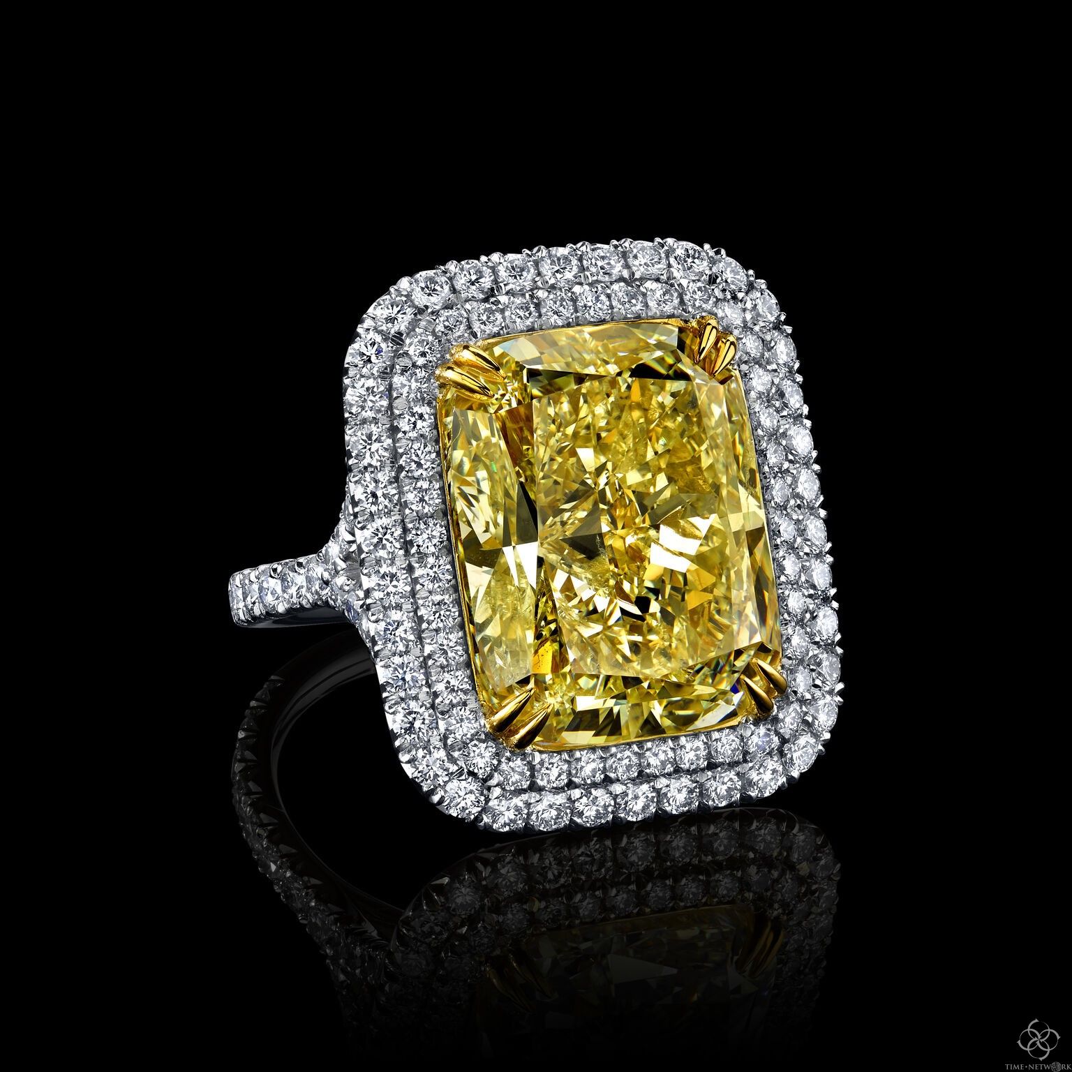 同样艳丽的黄色钻石也非常令人印象深刻。17.49克拉金丝雀天然花式浅黄色,I1,辐射切割3石钻石戒指,两侧镶有两颗锥形法式面包钻石。让佩戴者瞬间魅力四射!