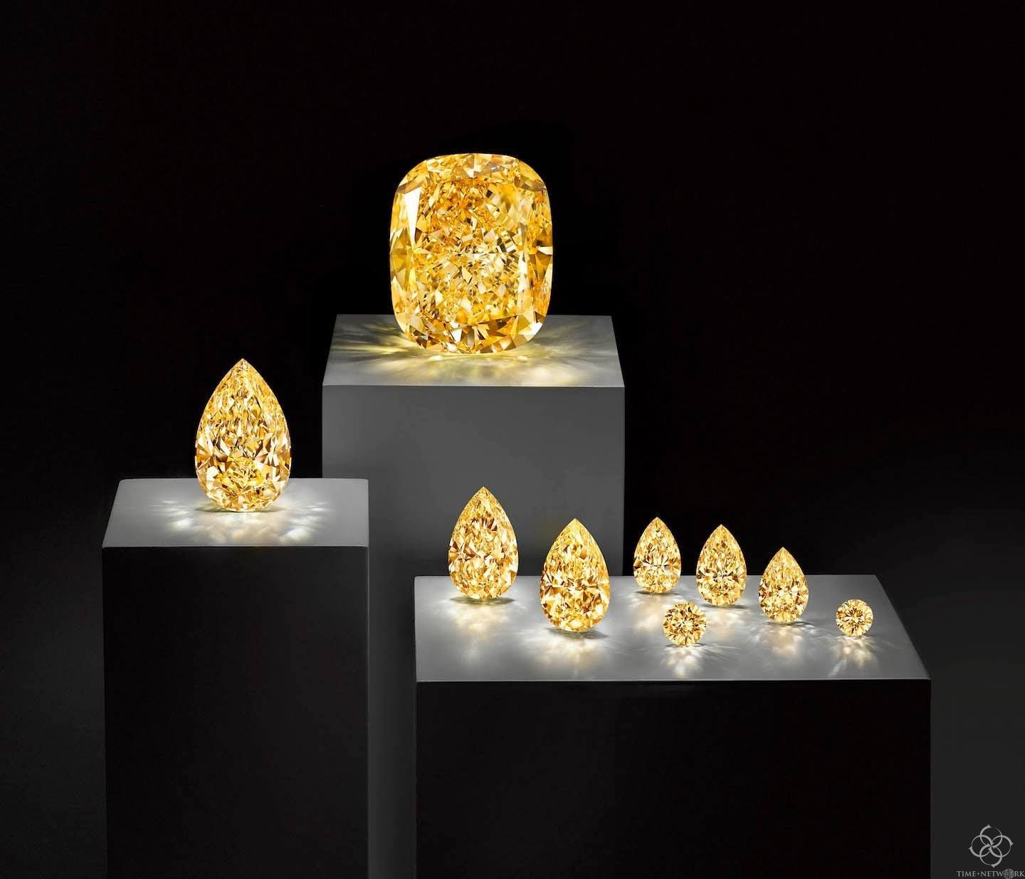 实际的切割和抛光过程也花费了数月的时间。最大的石头被命名为“金色皇后”,达到132.55克拉,颜色为鲜艳的深黄色(VVS1净度)。另外六种鲜艳的颜色被切割成梨形(最大的21.34克拉),两种较小的颜色被切割成圆形。