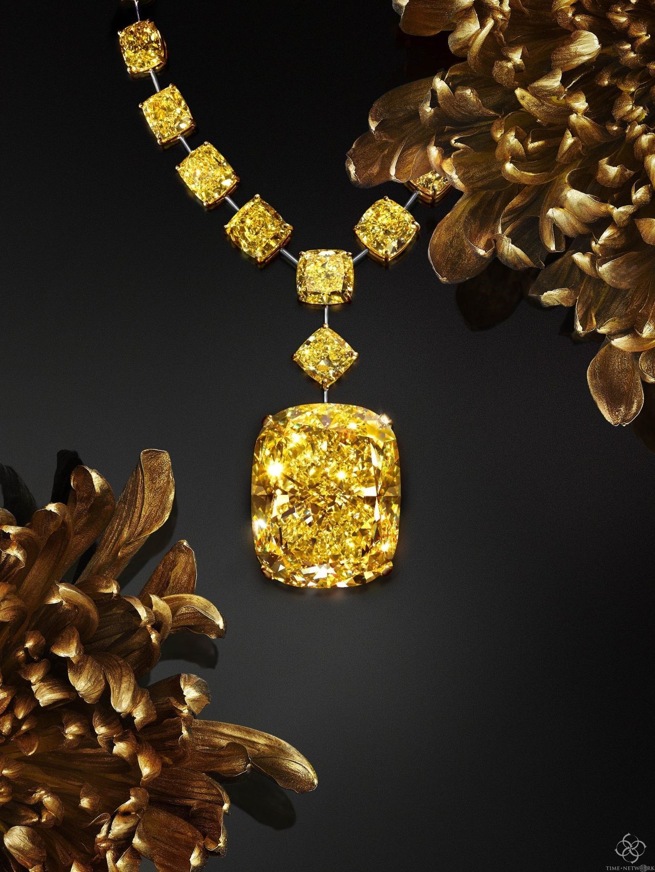 这颗钻石被制作成顶级品牌一条奢华的黄色钻石项链中的吊坠,项链上还镶嵌着30颗别致的彩色钻石,成为无价的传奇黄钻!