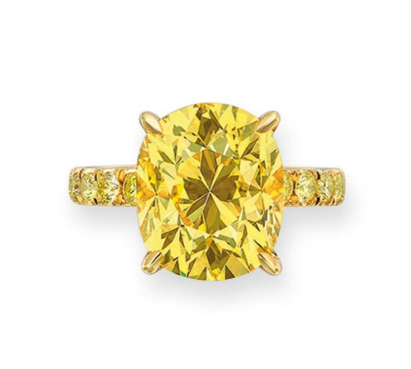 Gold ring centered with a 7.03-carat fancy vivid yellow cushion brilliant-cut diamond with an ... [+]$388,732 - $647,886